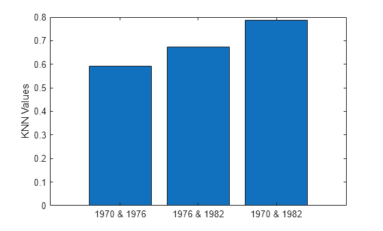 years = ["1970 & 1976","1976 & 1982","1970 & 1982"]; knnValues = [knn7076,knn7682,knn7082]; bar(years,knnValues) ylabel("KNN Values")