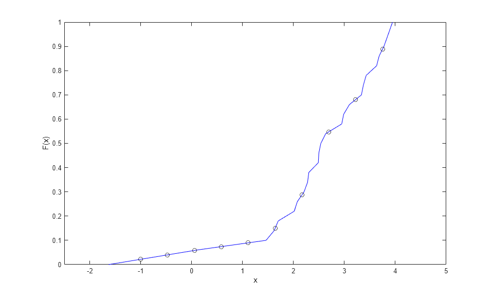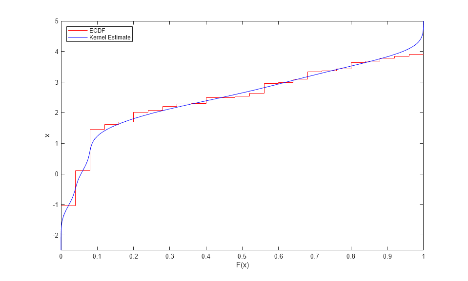 The ecdf function computes one type of nonparametric CDF estimate, the empirical CDF, which is a stairstep function. This example illustrates some smoother alternatives, which may be more suitable for simulating or transforming data from a continuous distribution.
