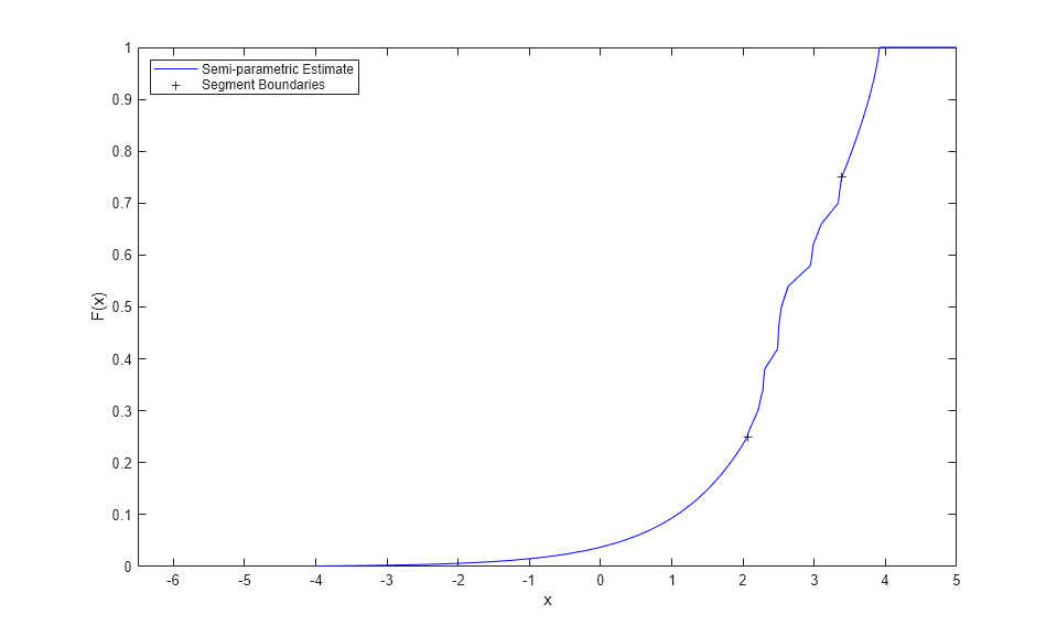 For example, you might define the "center" of the data as the middle 50%, and specify that the transitions between the nonparametric estimate and the Pareto fits take place at the .25 and .75 quantiles of your data. To evaluate the CDF of the semiparametric model fit, use the fit's cdf method.
