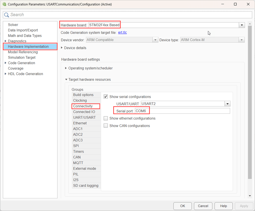 2. Press CTRL+E to open Configuration Parameters dialog box. Go to Hardware implementation > Hardware board > Target hardware resources > Connectivity and specify the COM Port and USART.
