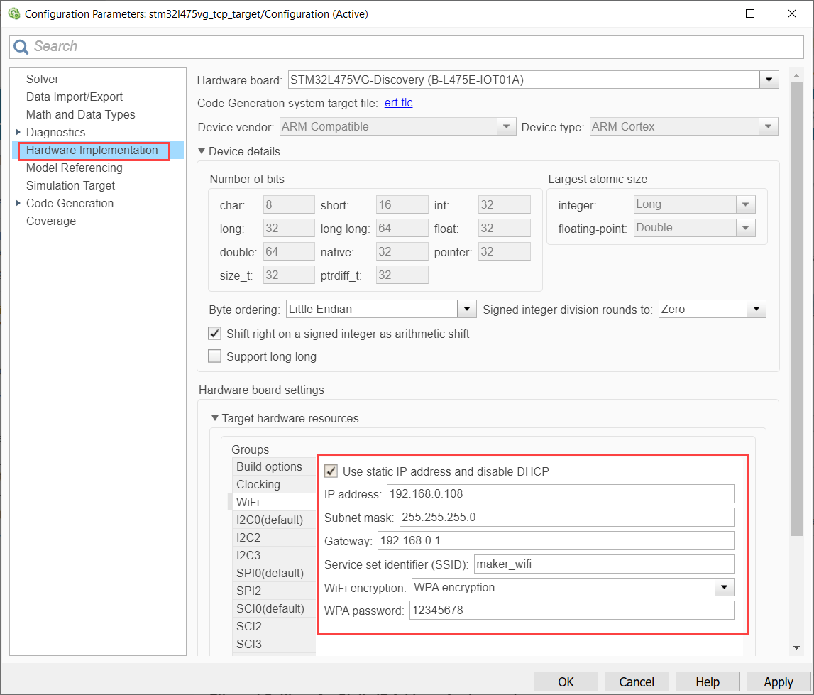 2. Navigate to Hardware Implementation > Hardware board settings > Target hardware resources > WiFi and select the Use static IP address and disable DHCP box.