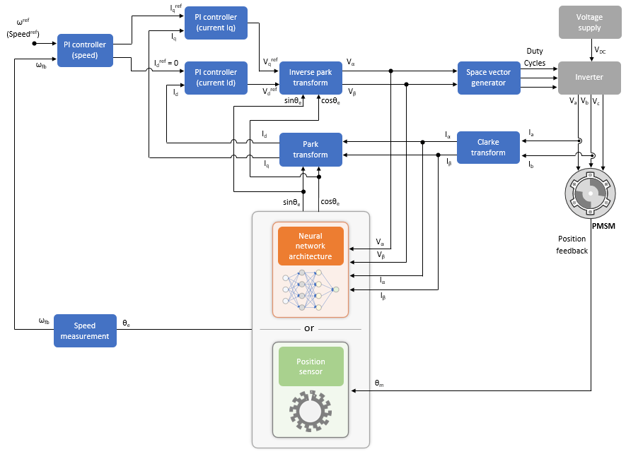 This example shows how to implement field-oriented control (FOC) of a permanent magnet synchronous motor (PMSM) using rotor position estimated by an auto-regressive neural network (ARNN) trained with Deep Learning Toolbox™.