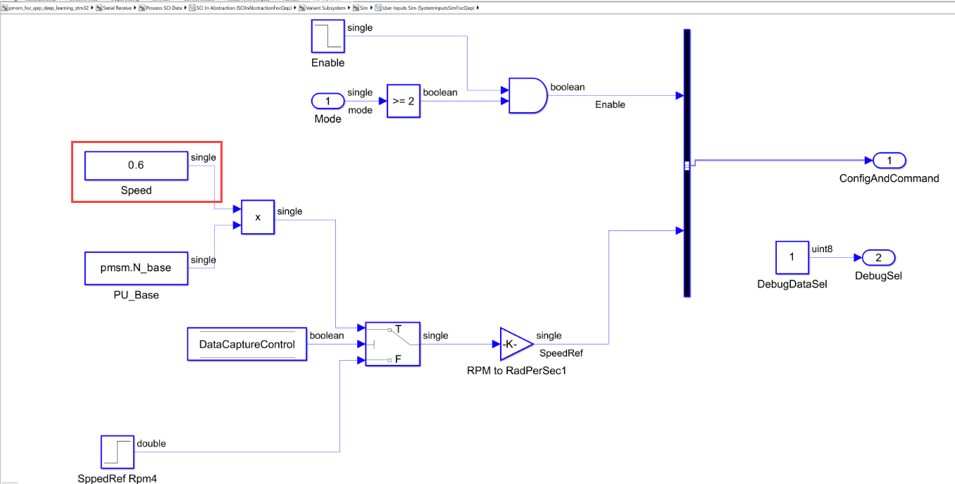 Speed(available in the pmsm_foc_qep_deep_learning_stm32/Serial Receive/Process SCI Data/SCI In Abstraction/Variant Subsystem/Sim/User Inputs Sim/Speed) to select a speed reference value.