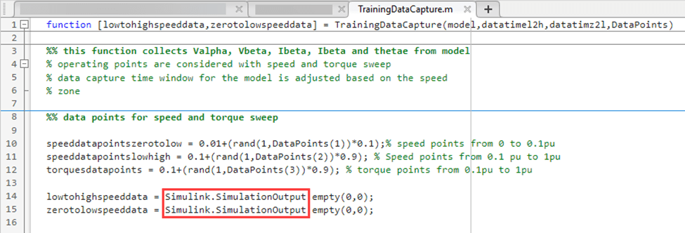 The TrainingDataCapture utility function simulates the target model at each speed-torque operating point. After simulation begins for an operating point, the utility function captures the Vα, Vβ, Iα, Iβ, and θe data only for a limited duration defined by these variables: