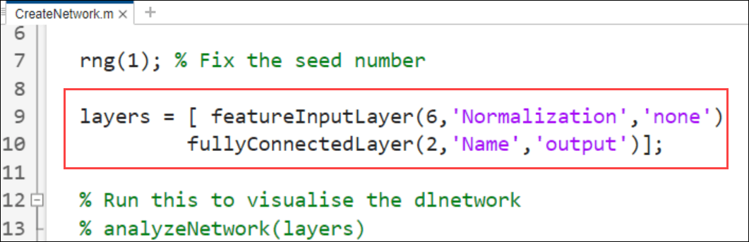 The CreateNetwork utility function generates a trained ARNN that contains two fully connected layers and an activation layer. The following figure shows the code snippet that defines the neural network layers.