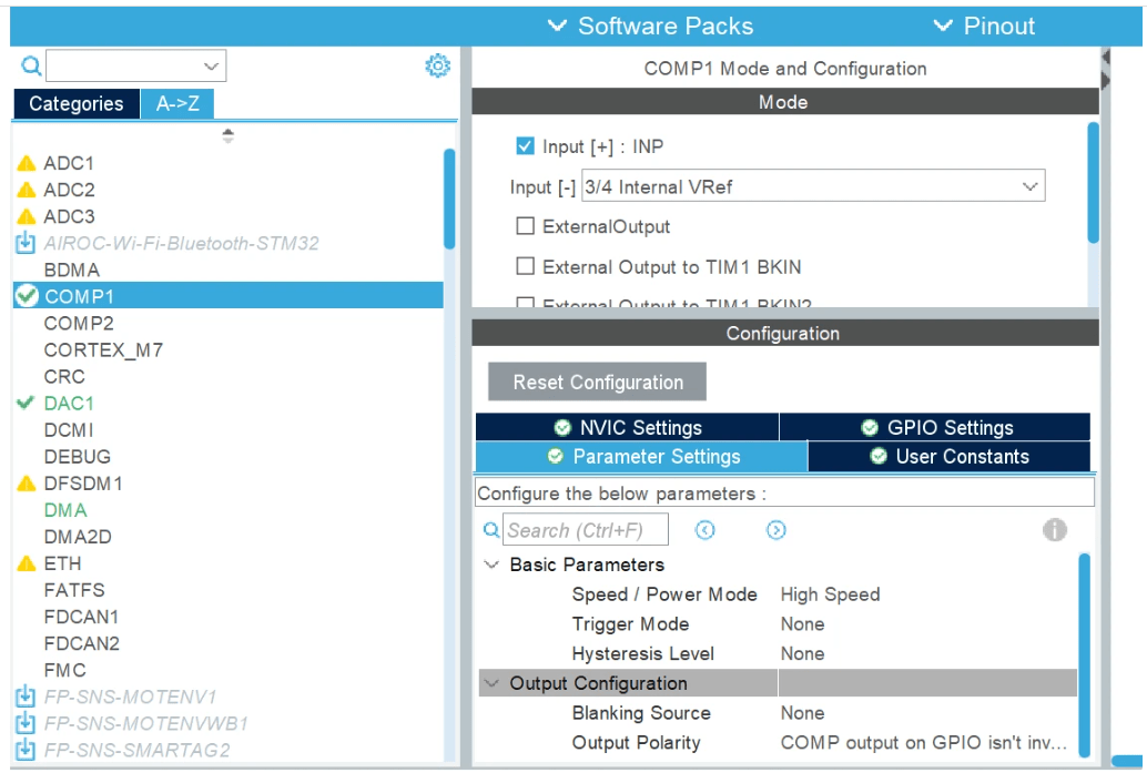 Use STM32CubeMx to specify the mode and required IOC configuration for each comparator.