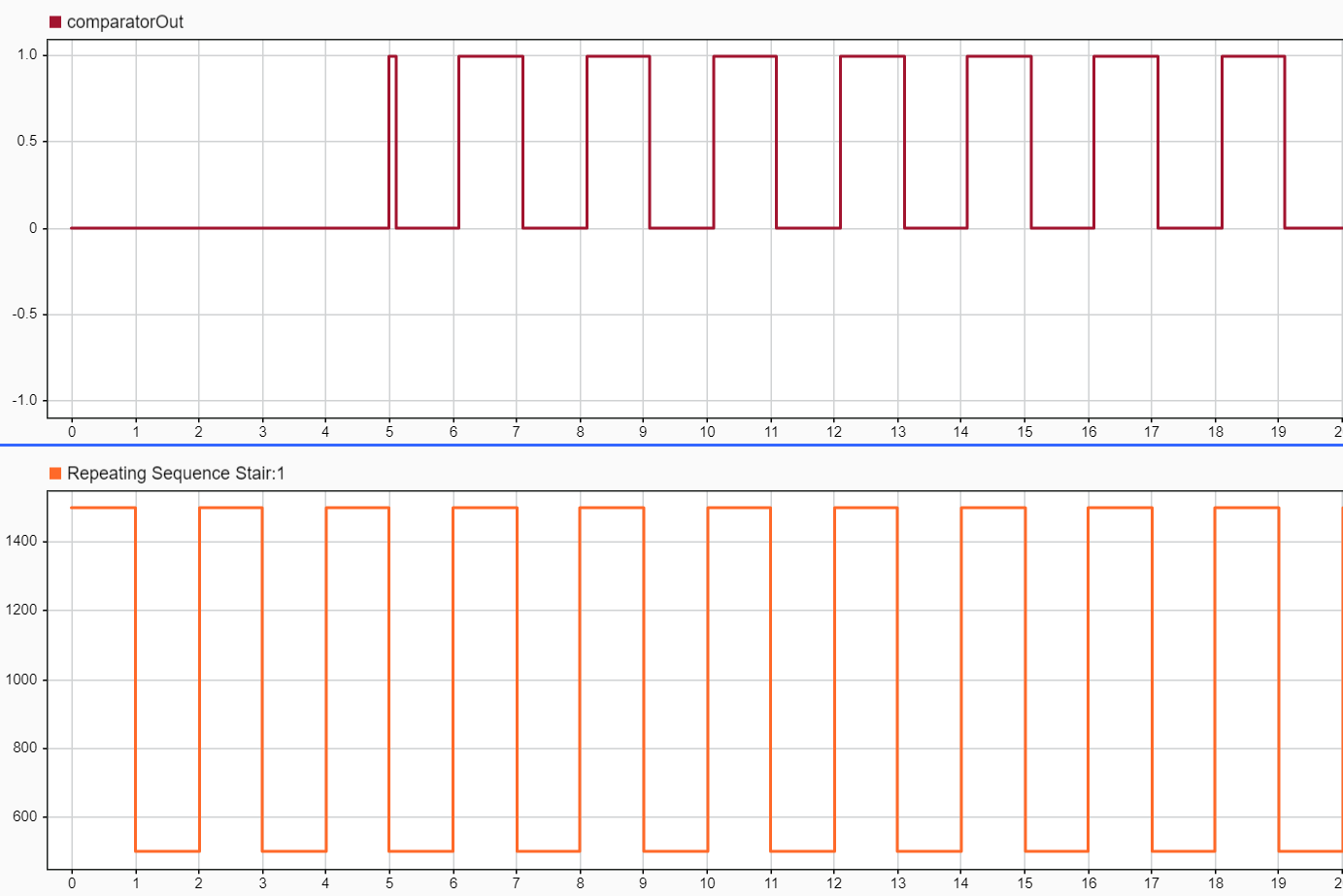 • Status (Step Block) Waveform - The status signal remains high (1.0) for the first five seconds of the simulation, then steps down to low (0.0). This transition at the 5-second mark serves as the enable trigger that activates the comparator outputs.