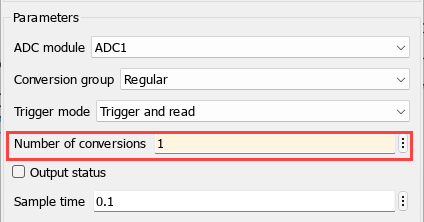 Double-click the ADC block to open the block parameters dialog box. Set the Number of conversions parameter to