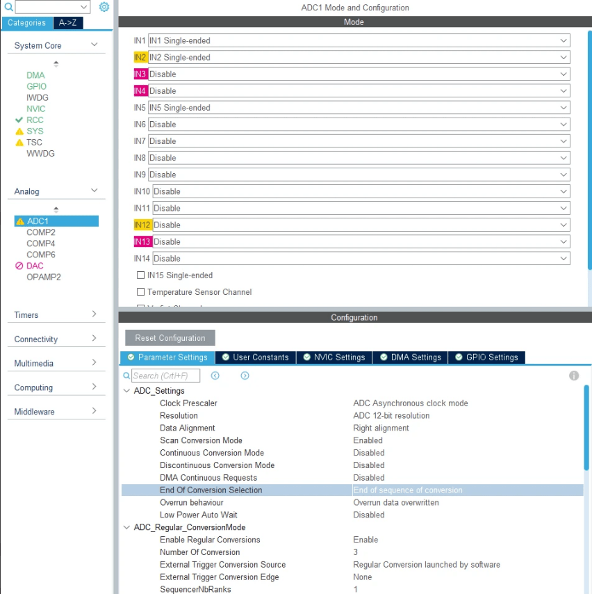 Navigate to Pinout & Configuration > Analog and configure the ADC settings as shown in this image.