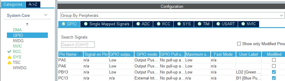 Navigate to Pinout & Configuration > System Core and configure the GPIO settings.