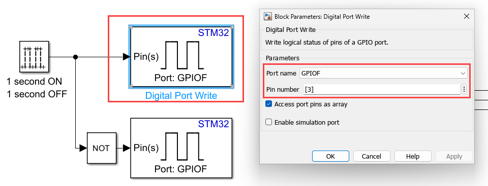 2. Configure the GPIO block. Double-click the block to open the block parameter dialog box.