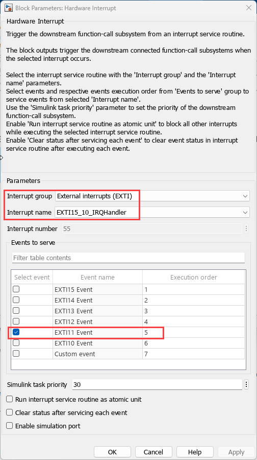 2. In STM32 processor based boards, for the I2C calls to work from within ISR, the interrupt priority of the external interrupt must be modified. The interrupt priority is modified using the System Outputs block. In this example, since PE11 is configured as the external interrupt, NVIC_SetPriority(EXTI4_IRQn,0xFF); is added to the System Outputs block. The IRQn can vary with respect to targets and pins. You can modify the IRQn based on the pin and target selection.