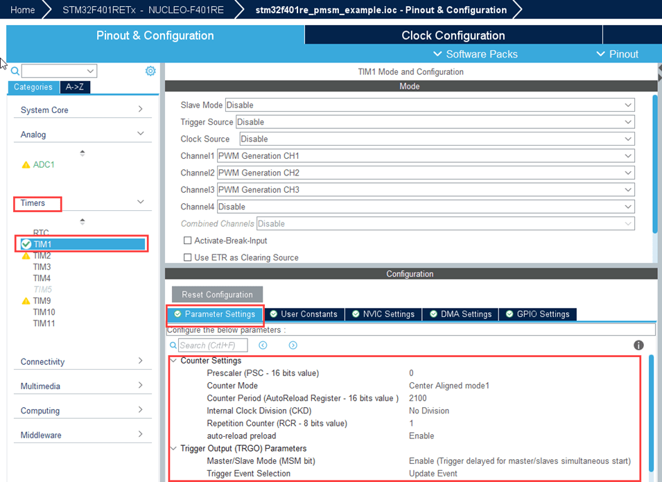 Timer1is configured to generate update events to synchronize the ADC with the PWM. This synchronization is important to read current feedback at right time.The repetition counter is set to 1 to ensure update events occur once every period.
