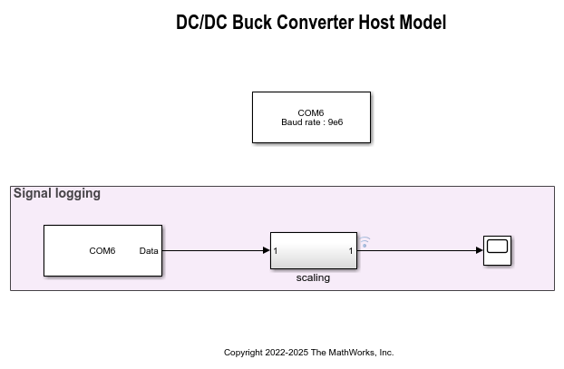 4. Observe the signal logging in the Host model to read the Vout as transmitted from the target model. The following hardware result shown are for Buck Converter.