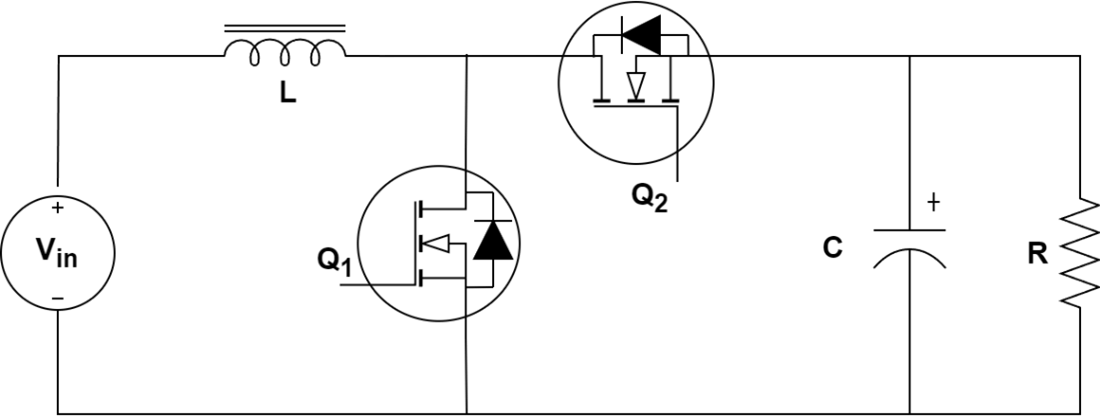 The B-G474E-DPOW1 Discovery kit contains a synchronous boost converter power stage. A simplified schematic of the power stage for a synchronous boost converter is shown below.