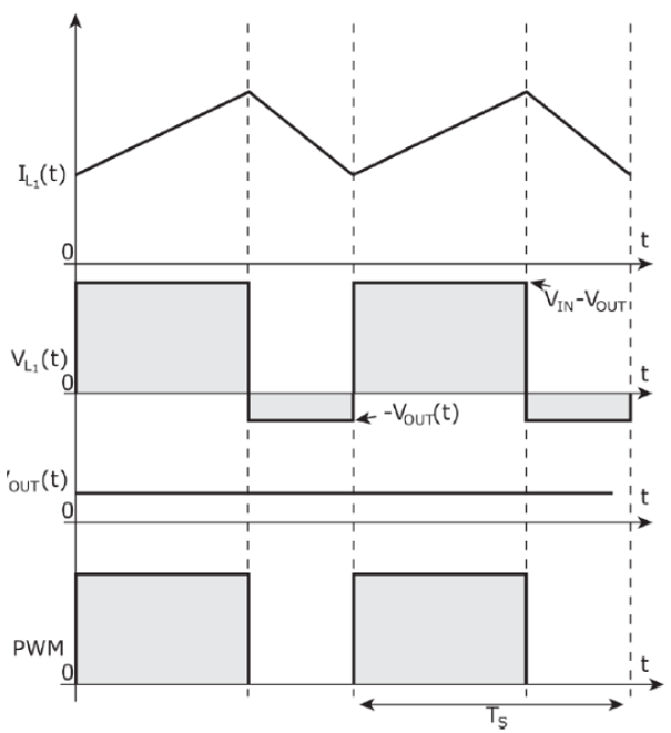 At the beginning of the switching period, the PWM of the bottom switch (Q1) is set HIGH and the top switch (Q2) is set LOW. This turns on MOSFET-Q1 and turns off MOSFET Q2. With the Q1 switch conducting, the current through the inductor L1 begins increasing linearly. At the end of the low-side duty cycle, the switch Q1 is turns off.