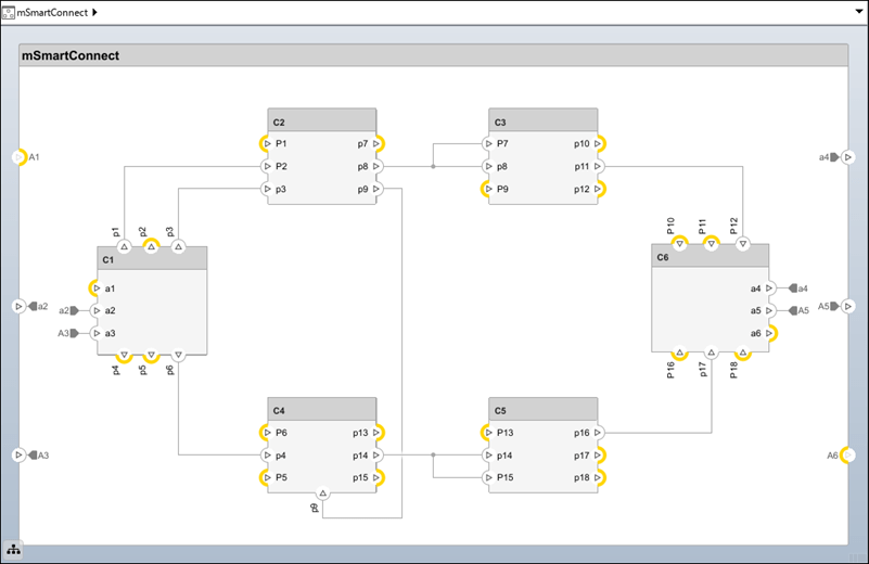 From the toolstrip, on the Connect tab, select Smart Connect. Connections are made using the default port connection policy, establishing connections between ports of the same name.
