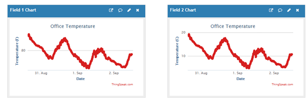 write2TSData( channelID , dataFieldOne , fahrenheitTemperature , dataFieldTwo , celsiusTemperature , dataFieldThree , millis() ); // Write the temperature in F, C, and time since starting.