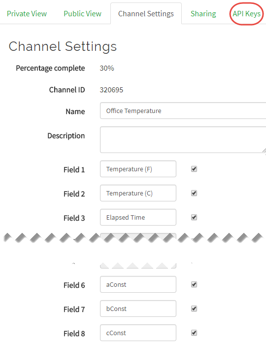 a,betcsont des estimations. Vous pouvez commencer avec ces valeurs, puis calibrer votre thermistance comme décrit dans Calibrate Temperature Coefficients. Modifiez le texte suivant avec votre clé d'API en écriture et collez-le directement dans la barre d'adresse de votre navigateur.Définissez le coefficient
