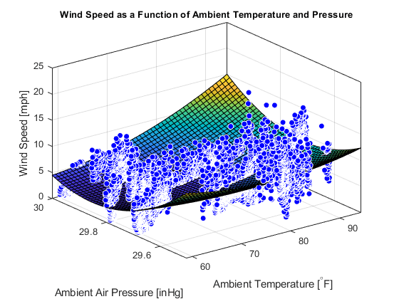 plot(fitObject,[data.TemperatureF,data.PressureHg],data.WindSpeedmph); xlabel('Ambient Temperature [^{\circ}F]'); ylabel('Ambient Air Pressure [inHg]'); zlabel('Wind Speed [mph]'); title('Wind Speed as a Function of Ambient Temperature and Pressure','FontSize',10);