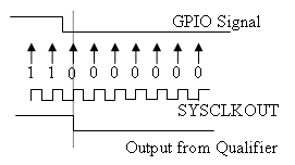 • Synchronize to SYSCLKOUT only—This setting is the default for all pins at reset. Using this qualification type, the input signal is synchronized to the system clock, SYSCLKOUT. The following figure shows the input signal measured on each tick of the system clock, and the resulting output from the qualifier.