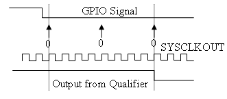 The following figure shows the SYSCLKOUT ticks, a sample taken every clock tick, and the Qualification type set to Qualification using 3 samples. In this case, the Qualification sampling period=0: