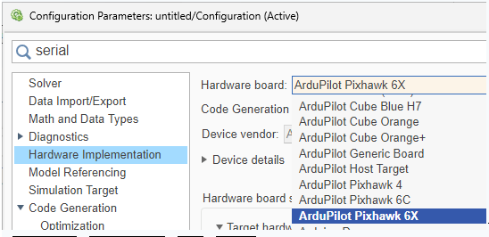 ii. In the Configuration Parameters dialog box, navigate to Hardware Implementation > Hardware board and select ArduPilot Pixhawk 6x from the dropdown.
