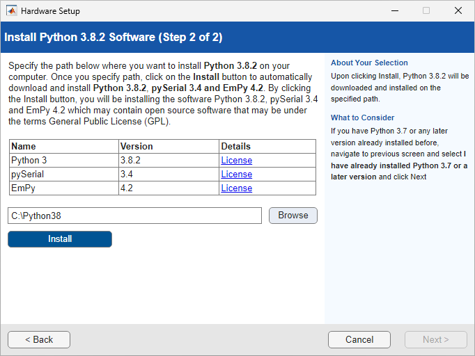 Specify the path where you want to install Python 3.8.2 in your computer and click Install. Python 3.8.2, pySerial 3.4, and EmPy 4.2 are installed on that path. After successful installation, click Next for subsequent screens.