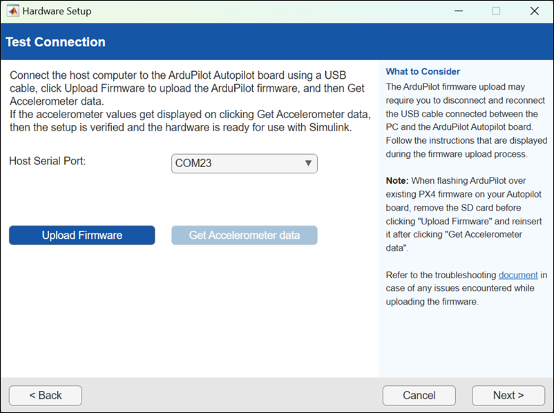 Testing the connection to the autopilot or hardware board is a crucial step in verifying that your selected hardware can communicate with the UAV Toolbox Support Package for ArduPilot® Autopilots. By following these steps, you will ensure that your hardware is running the correct firmware, enabling reliable communication and operation with the support package.