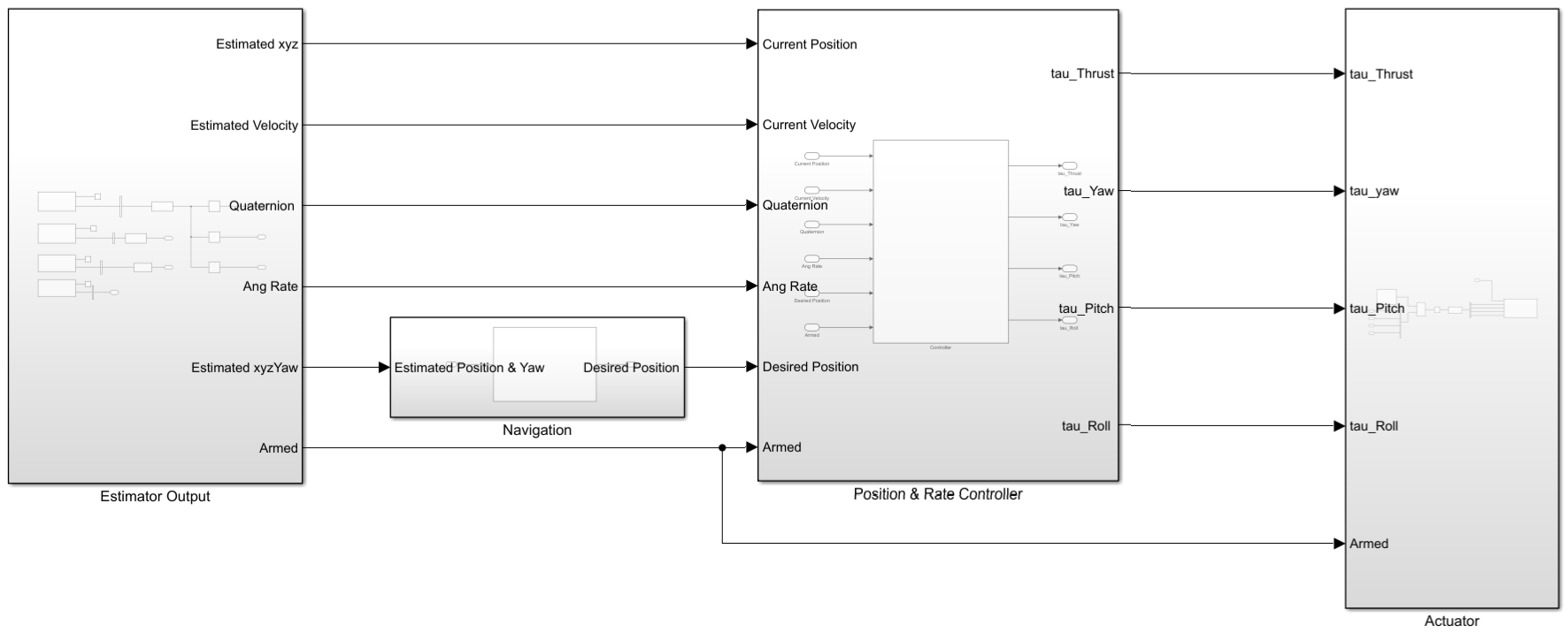 • Position & Rate Controller - Takes Current Position, Current Velocity, Quaternion, Angular rate, Desired Position and Arm status as inputs from the Estimator output and Navigation subsystems. It uses discrete PID(z) and P(z) controllers in different configurations to obtain the desired tau_Thrust, tau_Yaw, tau_Pitch, and tau_Roll as inputs for the Actuator subsystem.