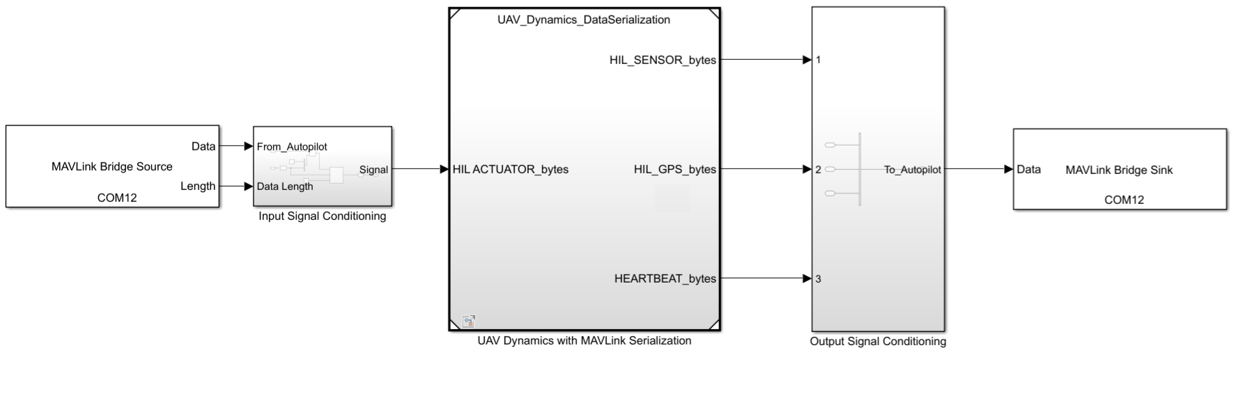 • Input Signal Conditioning - Conditions the signal from the autopilot based on the data length and reshapes it into the input to the UAV Dynamics with the MAVLink Serialization subsystem.
