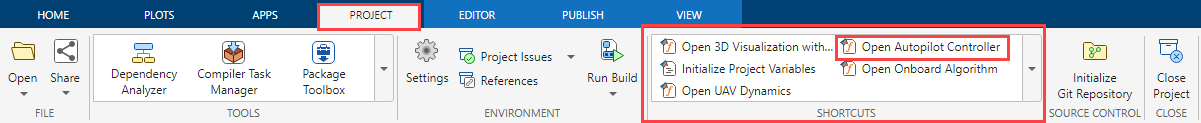 • In the Project tab, in the Shortcuts section, click Open Autopilot Controller to open the PX4 controller model, Quadcopter_ControllerWithNavigation.