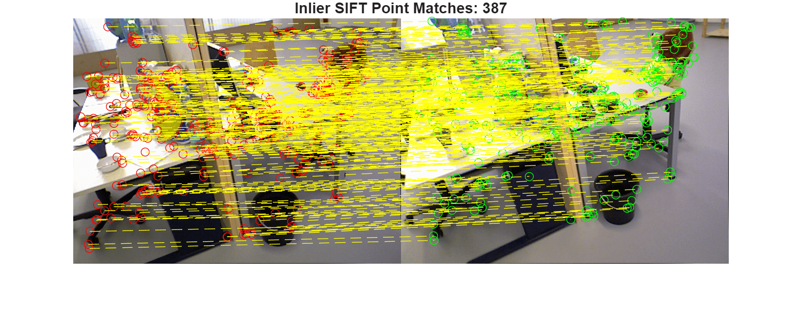 figure showMatchedFeatures(I1,I2,inlierPoints1,inlierPoints2,"montage",PlotOptions=["ro","go","y--"]); title("Inlier SIFT Point Matches: " + num2str(nnz(inliers))); truesize