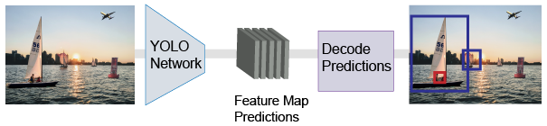 The YOLO v2 model runs a deep learning CNN on an input image to produce network predictions. The object detector decodes the predictions and generates bounding boxes.
