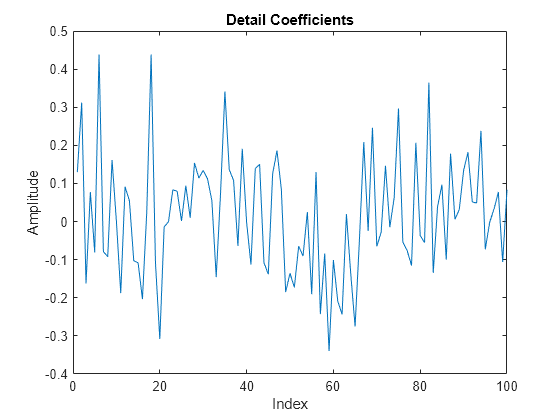 LS = liftingScheme; [A,D] = lwt(x,'LiftingScheme',LS,'Level',1); plot(D{1}) xlim([0 100]) title('Detail Coefficients') xlabel('Index') ylabel('Amplitude')