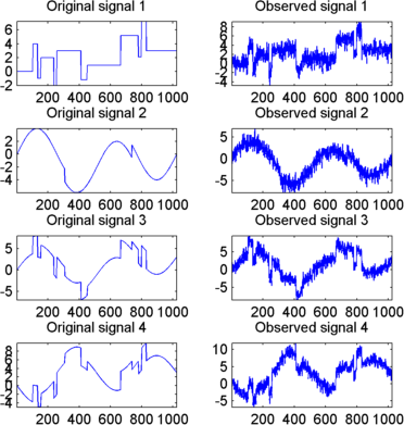 kp = 0; for i = 1:4 subplot(4,2,kp+1), plot(x_orig(:,i)); axis tight; title(['Original signal ',num2str(i)]) subplot(4,2,kp+2), plot(x(:,i)); axis tight; title(['Observed signal ',num2str(i)]) kp = kp + 2; end