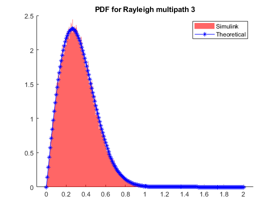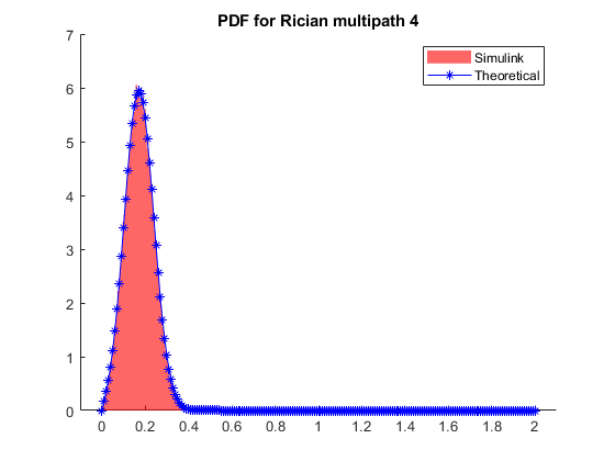 squeezeChOut = squeeze(out.chScalar); repmatChValid = squeeze(out.chScalarValid); reqdChValid = repmatChValid.'; chCoeff = squeezeChOut(boolean(reqdChValid)); [chCoeffRows, ~ ] = size(chCoeff); chanMatRowSize = floor(chCoeffRows/(discretePathDelays(end)+1)); chanSize = chanMatRowSize * (discretePathDelays(end)+1); chanCoeffOut = reshape(chCoeff(1:chanSize),(discretePathDelays(end)+1),chanMatRowSize).'; pathGainlin=10.^(avgPathGainsdB/10); if normAvgPowTo0dB avgPowLin=pathGainlin/sum(pathGainlin); else avgPowLin=pathGainlin; %#ok<UNRCH> end % Plot PDF fadProbDist = get_param('HDLFadingChannel/SISO Fading Channel','fadingDistri'); if strcmp(fadProbDist,'Rician') if length(KFactor) < length(discretePathDelays) KFactor = [KFactor zeros(1,length(discretePathDelays)-length(KFactor))]; end for pathNum = 1:length(discretePathDelays) if KFactor(pathNum) fadStr = 'Rician'; else fadStr = 'Rayleigh'; end figure (pathNum) str = sprintf('PDF for %s multipath %d',fadStr,pathNum); title(str) hold on histogram(abs(chanCoeffOut(:,discretePathDelays(pathNum)+1)),500,... 'Normalization','pdf','BinLimits',[0 2],'FaceColor','red', ... 'EdgeColor','none'); x = (0:0.01:2); p = pdf('Rician',x,sqrt(avgPowLin(pathNum)*KFactor(pathNum)/(KFactor(pathNum)+1)),sqrt(avgPowLin(pathNum)/(2*(KFactor(pathNum)+1)))); plot(x,p,'-b*') str1 = sprintf('Simulink'); str2 = sprintf('Theoretical'); legend(str1,str2) end else for pathNum = 1:length(discretePathDelays) figure (pathNum) str = sprintf('PDF for Rayleigh multipath %d',pathNum); title(str) hold on histogram(abs(chanCoeffOut(:,discretePathDelays(pathNum)+1)),500,... 'Normalization','pdf','BinLimits',[0 2],'FaceColor','blue', ... 'EdgeColor','none'); x = (0:0.01:2); p = raylpdf(x,sqrt(avgPowLin(pathNum)/2)); plot(x,p,'-r*') str1 = sprintf('Simulink'); str2 = sprintf('Theoretical'); legend(str1,str2) end end