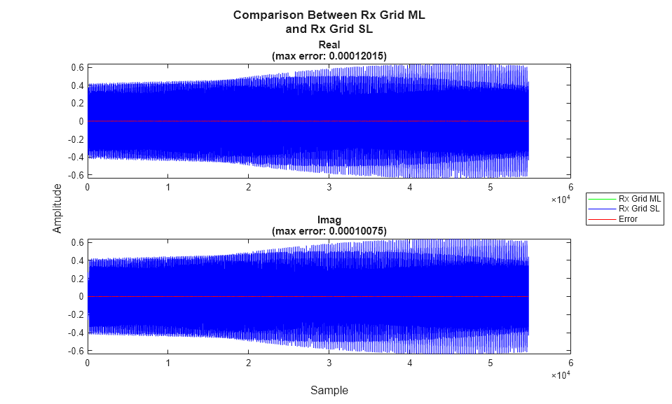 runIntroOFDMSLscript runs the Simulink simulations for the transmitter and receiver, using the resource grid structure, contents, and the design constants fromrunIntroOFDMML. Signal tap points in the Simulink model are compared with MATLAB to verify the numerical equivalence of the two implementations. The received bits are verified against the transmitted bits.