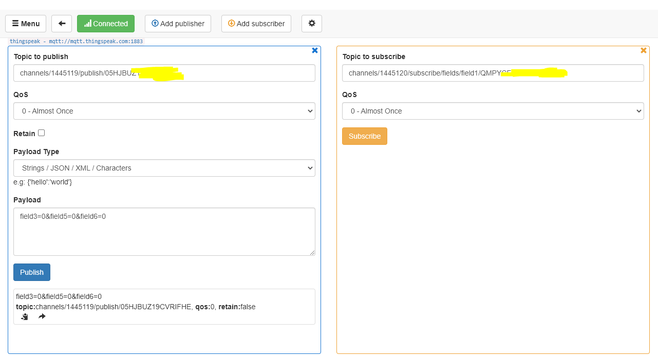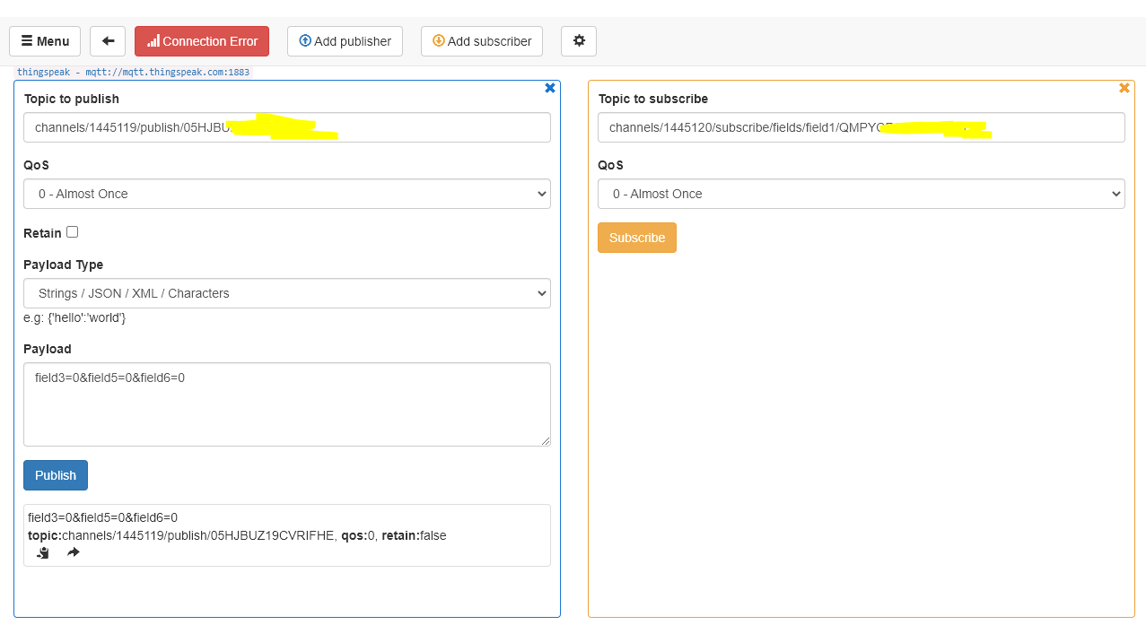A Thingspeak device is added with permission of publish and subscribe to a channel. But when starting subscribe, the server disconnected MQTT connection to the device. I'm using MQTTbox tool for testing.