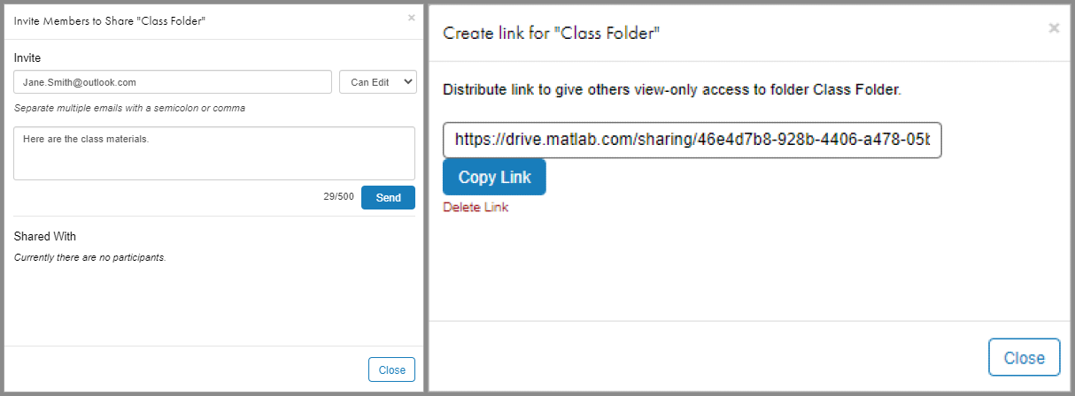 For example, instructors can share a read-only folder of class material with their students. Students can collaborate with peers on a common shared folder for group projects, and subsequently share it with their instructor for assessment. Thanks to full integration with MATLAB Online, you can view, modify, and run such shared files from within a web browser with just a few clicks.